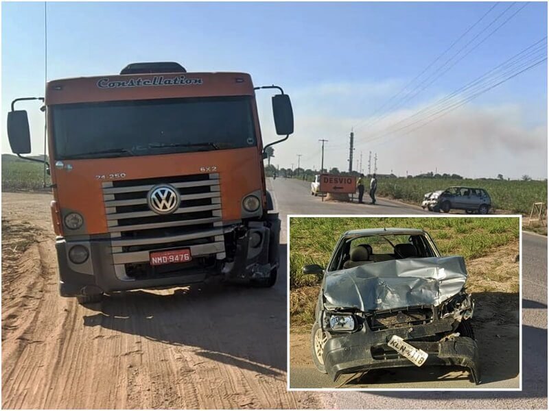 O condutor de um Fiat Uno Mille, cor cinza, placa KLN-4118/AL, foi socorrido na tarde desta terça-feira (23), após colidir frontalmente contra uma carreta no desvio da rodovia federal BR 101, em São Miguel dos Campos.