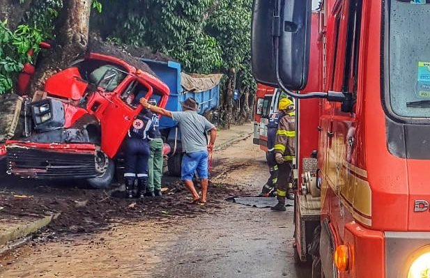 O motorista de uma caçamba Mercedes Benz, cor vermelha, colidiu contra uma arvore e ficou preso no interior do veículo. O sinistro aconteceu próximo a Nova Ceasa, na ‘ladeira da Utinga’, em Rio Largo.