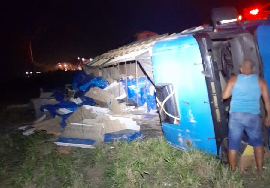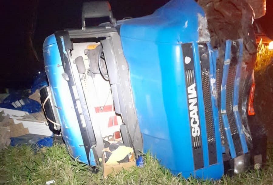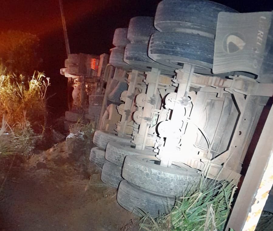 Na suposta tentativa de evitar o choque, o motorista do veículo pesado tentou desviar e acabou tombando as margens da pista.