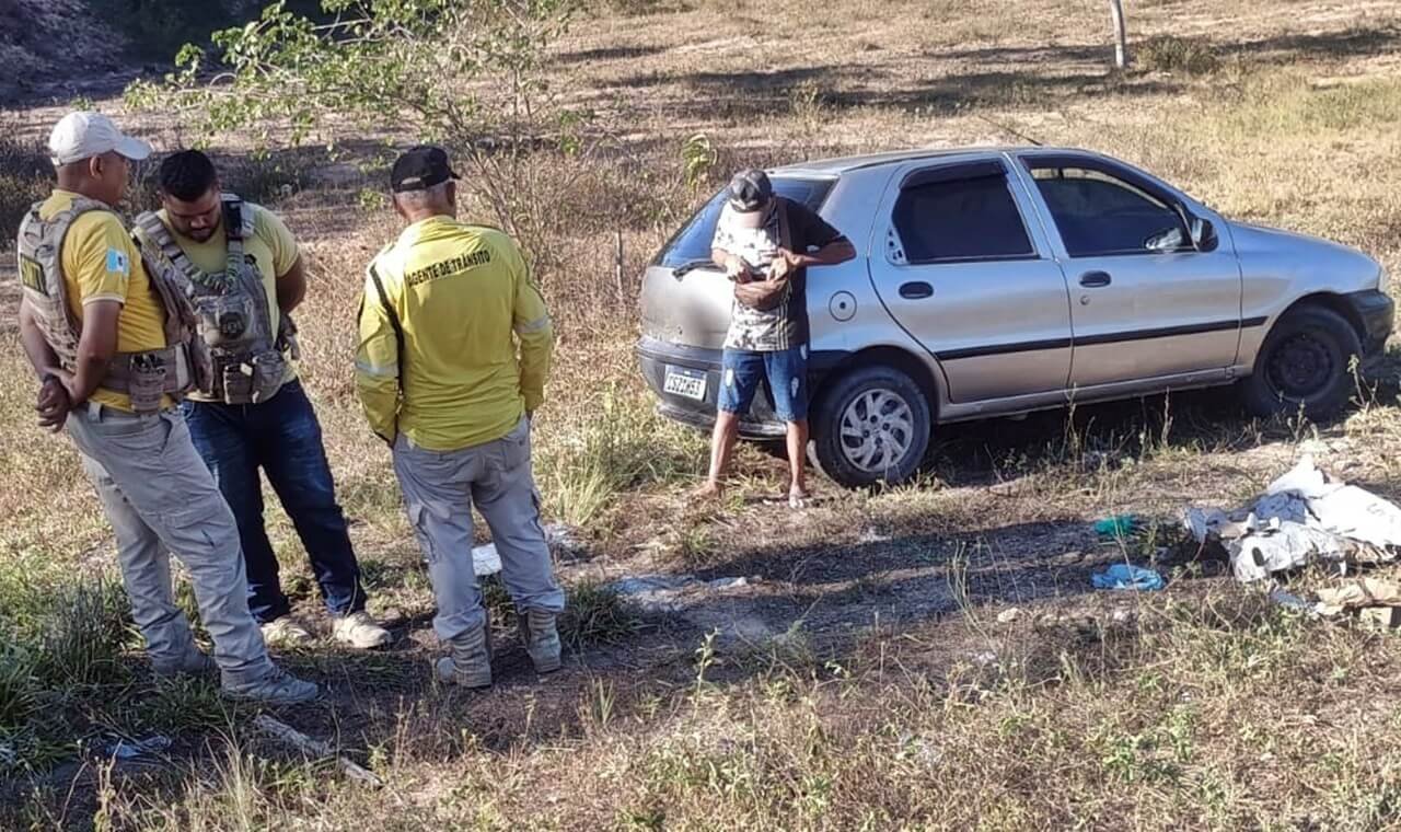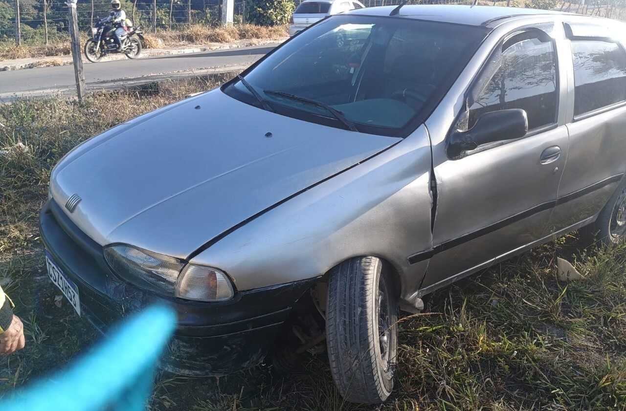 O veículo, um Fiat Palio prata, invadiu a contramão, atravessou a via, rompeu uma cerca de arame farpado e só parou dentro de um cercado.
