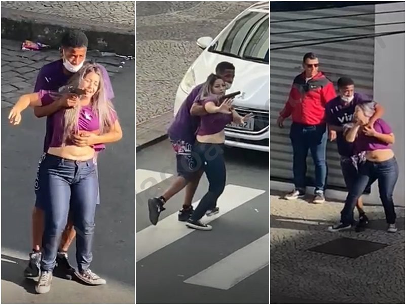 A mulher é funcionária da loja e foi levada por um dos assaltantes para a rua sob mira de uma pistola quando a polícia chegou ao local. O criminoso foi morto por um policial civil que passava pela região.