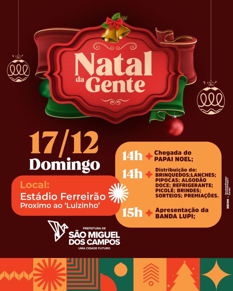 O Espírito natalino já toma conta de São Miguel dos Campos, e a Prefeitura convida todos os miguelenses para a edição 2023 do “Natal da Gente”, que será realizada domingo, dia 17, a partir das 14h, no Estádio Municipal Manoel Ferreira de Amorim (O Ferreirão).