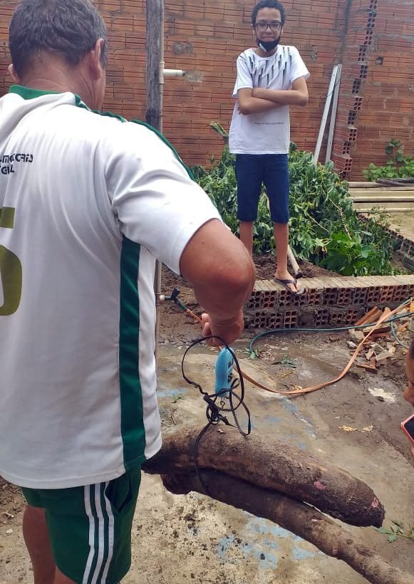 Assim como na primeira colheita, ‘Bigode’ precisou de ajuda da família e dos amigos para retirar o tubérculo inteiro da terra, “muito cuidado e paciência, para não acontecer como na colheita passada, perdemos uma de quase 1 metro”, lembrou enquanto trabalhava.