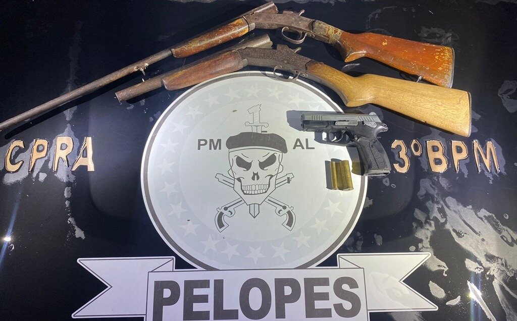 A guarnição realizou uma busca domiciliar após o flagrante e lá encontrou duas espingardas e um simulacro de pistola. Os ilícitos e o suspeito, um homem de 27 anos, foram conduzidos para a Central de Polícia Civil, em Arapiraca.