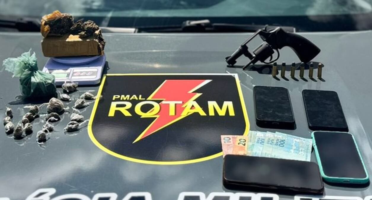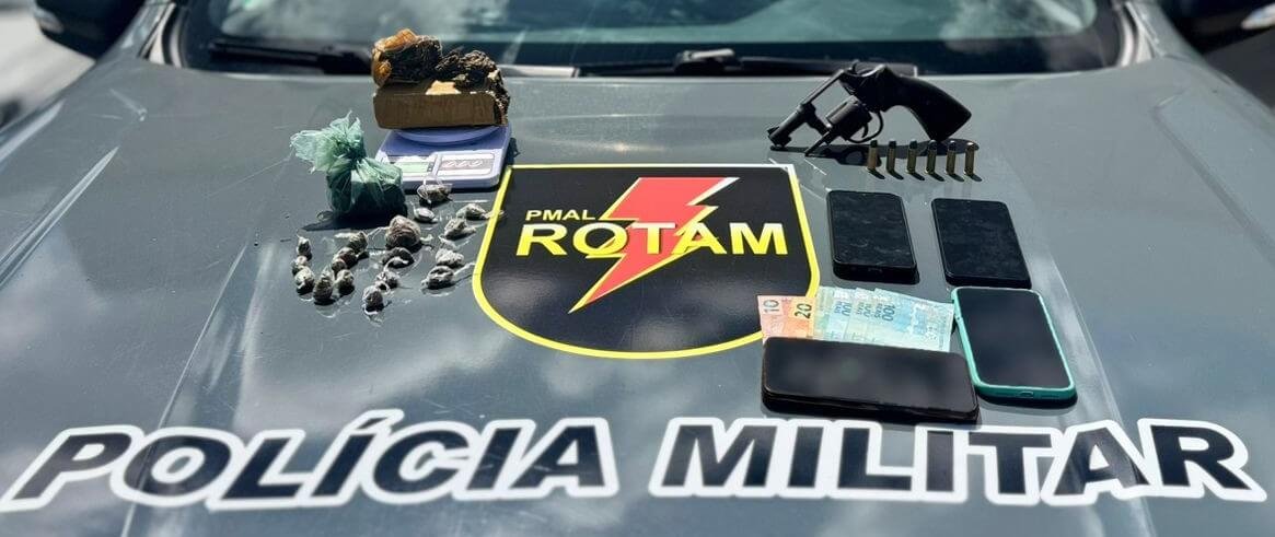 Durante procedimento de revista, os policiais encontraram cerca de 80 gramas de maconha dentro de uma bolsa, além de um revólver Taurus calibre 38, com seis munições (três intactas e três pinadas (acionadas, mas não deflagradas)).