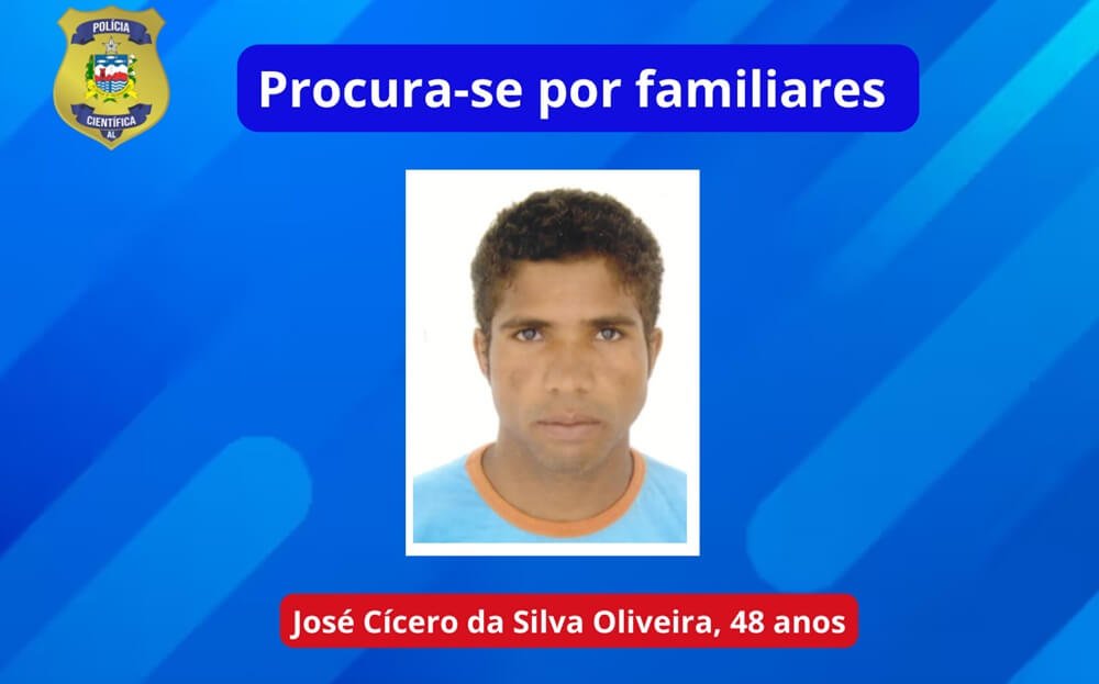 O Instituto Médico Legal de Arapiraca está à procura de familiares do andarilho José Cícero da Silva Oliveira, 48 anos, que vivia em situação de vulnerabilidade social. Seu corpo foi encontrado na zona rural de São Sebastião no dia 3 de março e recolhido para o IML como não identificado.