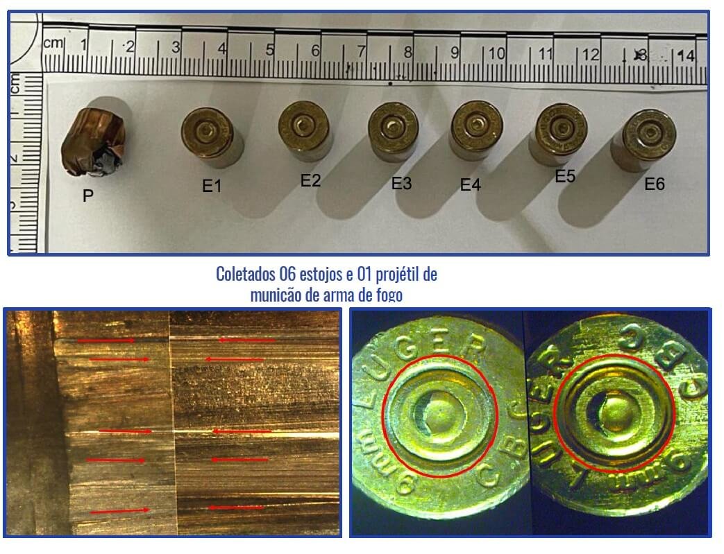 Outra importante prova técnica foi o resultado das análises feitas pelo perito criminal Ricardo Leopoldo nos projéteis recolhidos no local do crime, no corpo da vítima no IML e na arma apreendida com o suspeito. O exame de balística confirmou que os elementos de munição eram convergentes entre eles, ou seja, saíram da mesma arma, confirmando que a pistola 9 mm foi usada para cometer o crime.