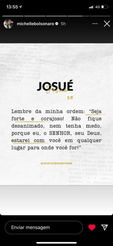 O post compartilhado por Michelle no domingo, dia 25, parte do perfil oficial da igreja, @cristojesusepoder, no Instagram. A primeira-dama compartilhou o conteudo que trás um verso da Biblia, no livro de Josué cap 1:9.