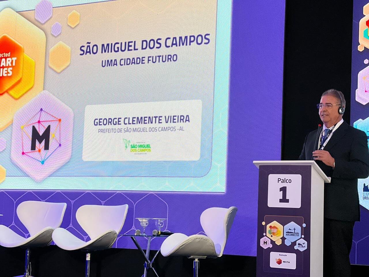 Encerrando sua participação no evento Connected Smart Cities & Mobility, na terça-feira (05), no Centro de Convenções Frei Caneca, em São Paulo (SP), o prefeito George Clemente realizou uma apresentação sobre sua história, que tem ligação total com o empreendedorismo, e também sobre o trabalho que vem sendo desenvolvido por ele à frente da Prefeitura de São Miguel dos Campos.