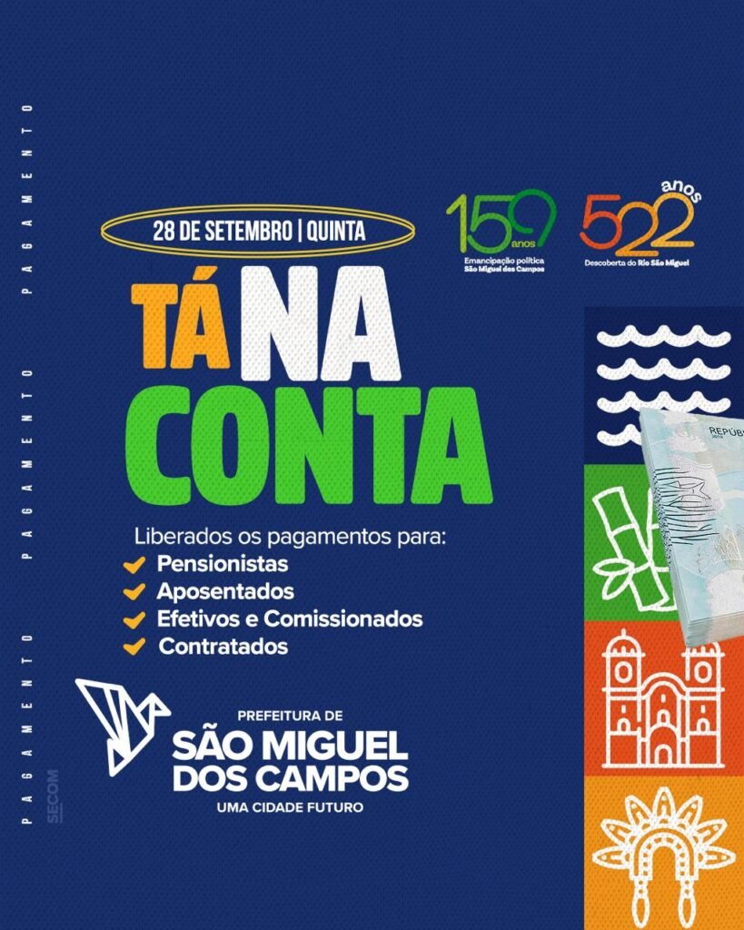 A Prefeitura de São Miguel dos Campos anunciou que o pagamento de todos os servidores públicos, referente ao mês de setembro, será liberado nesta quinta-feira, 28. Nas primeiras horas da manhã, os vencimentos já estarão nas contas bancárias.