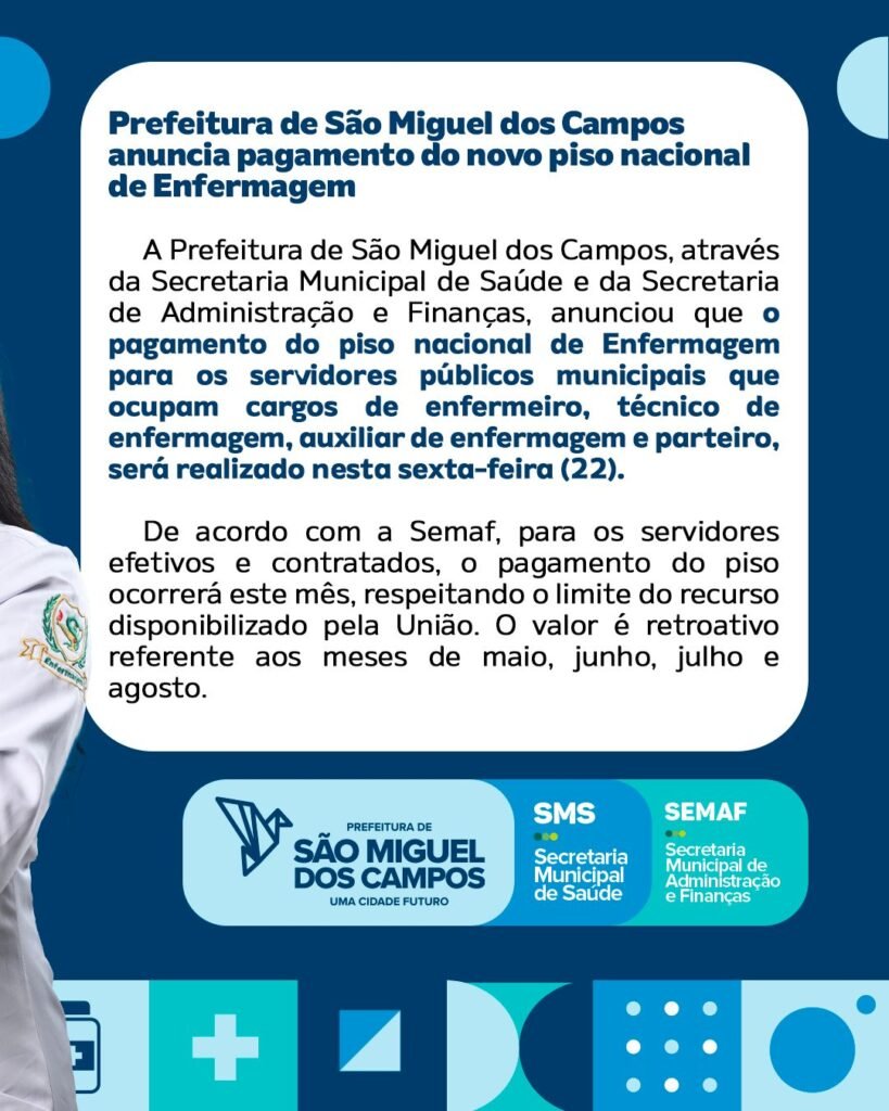 A Prefeitura de São Miguel dos Campos, através da Secretaria Municipal de Saúde e da Secretaria de Administração e Finanças, liberou nesta sexta-feira (22), o pagamento do piso nacional de Enfermagem para os servidores públicos municipais que ocupam cargos de enfermeiro, técnico de enfermagem, auxiliar de enfermagem e parteiro.