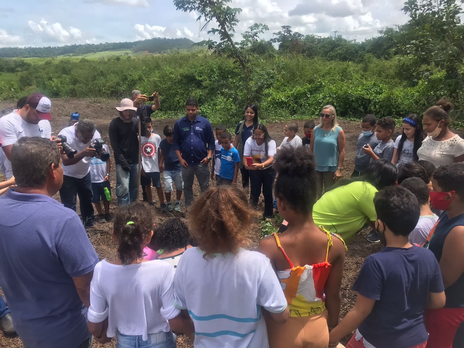 Alunos do Sistema Público de Ensino participaram da ação na Área de Proteção Permanente (APP), que compreende às encostas do Rio São Miguel. A área (mata ciliar do Rio) está em processo de recuperação ambiental.