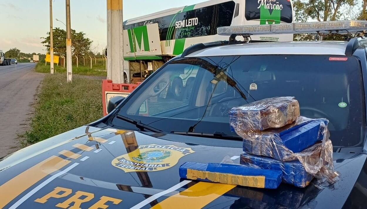 Equipes da PRF deram ordem de parada a um ônibus que vinha da Cidade Gaúcha/PR com destino a Maceió e, durante a abordagem, foi encontrada uma mochila com 15 tabletes de maconha com o peso total de 12kg.