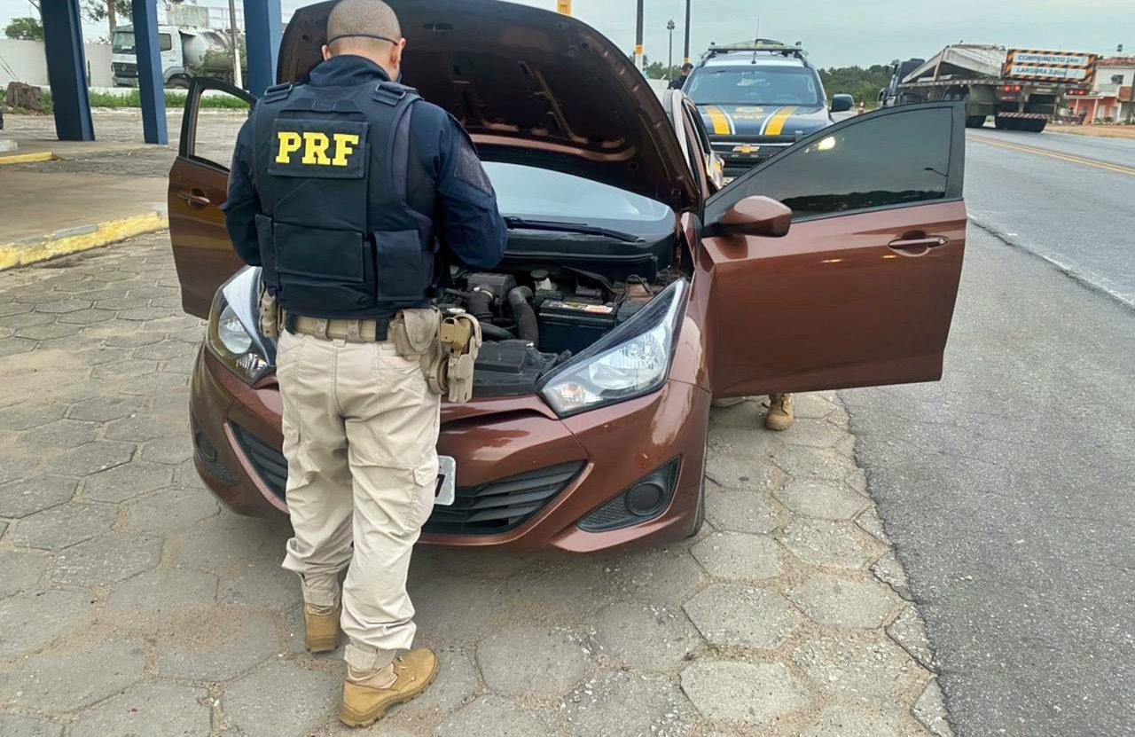 Através de pesquisas nos sistemas, constatou-se que a cor original do carro era preta e o veículo possuía restrição de roubo/furto registrada em janeiro de 2021, na cidade de Estância/SE. Ao ser questionado sobre a procedência do automóvel, o motorista alegou que comprou por R$ 23 mil, de uma pessoa e ele não sabia informar o nome.