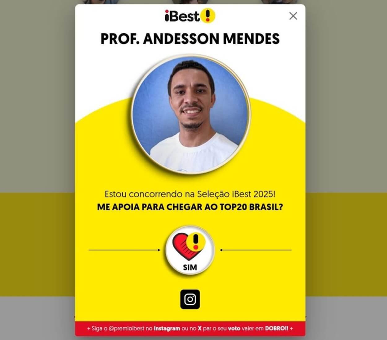 O processo de votação é aberto ao público e segue até o dia 13 de junho. Cada pessoa pode votar uma vez por dia, fazendo login com uma conta do Google ou outra plataforma. O link para votar no professor Mendes é: https://premioibest.vote/461974324