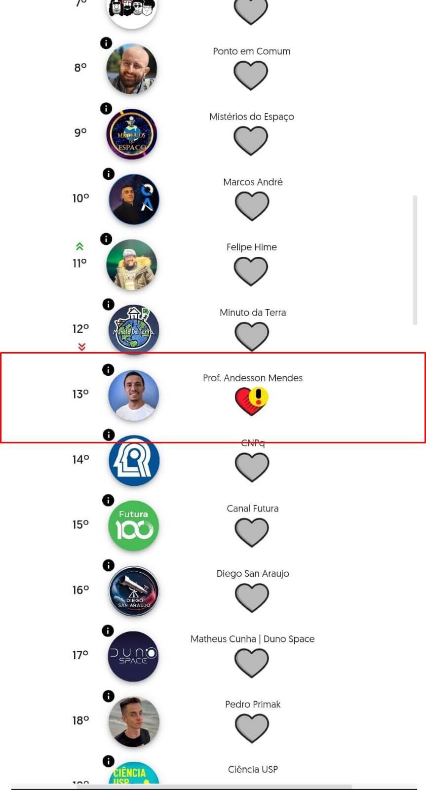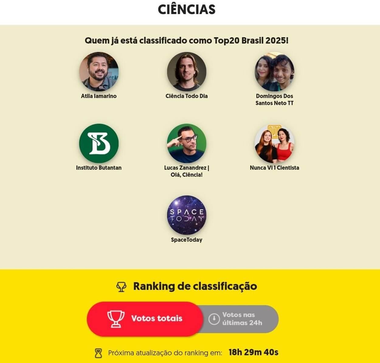 Atualmente, ele disputa espaço com grandes nomes da divulgação científica nacional e busca chegar ao TOP 20 da categoria, etapa decisiva da competição.