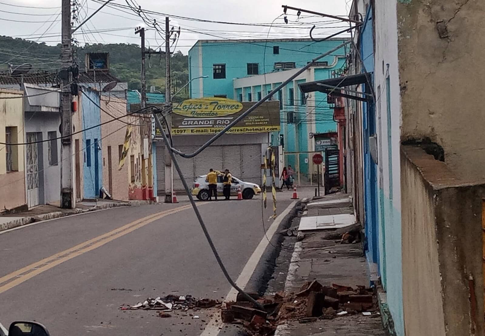Rua é interditada após caminhão baú arrancar fiação elétrica e destruir fachada de casa no Centro de São Miguel dos Campos