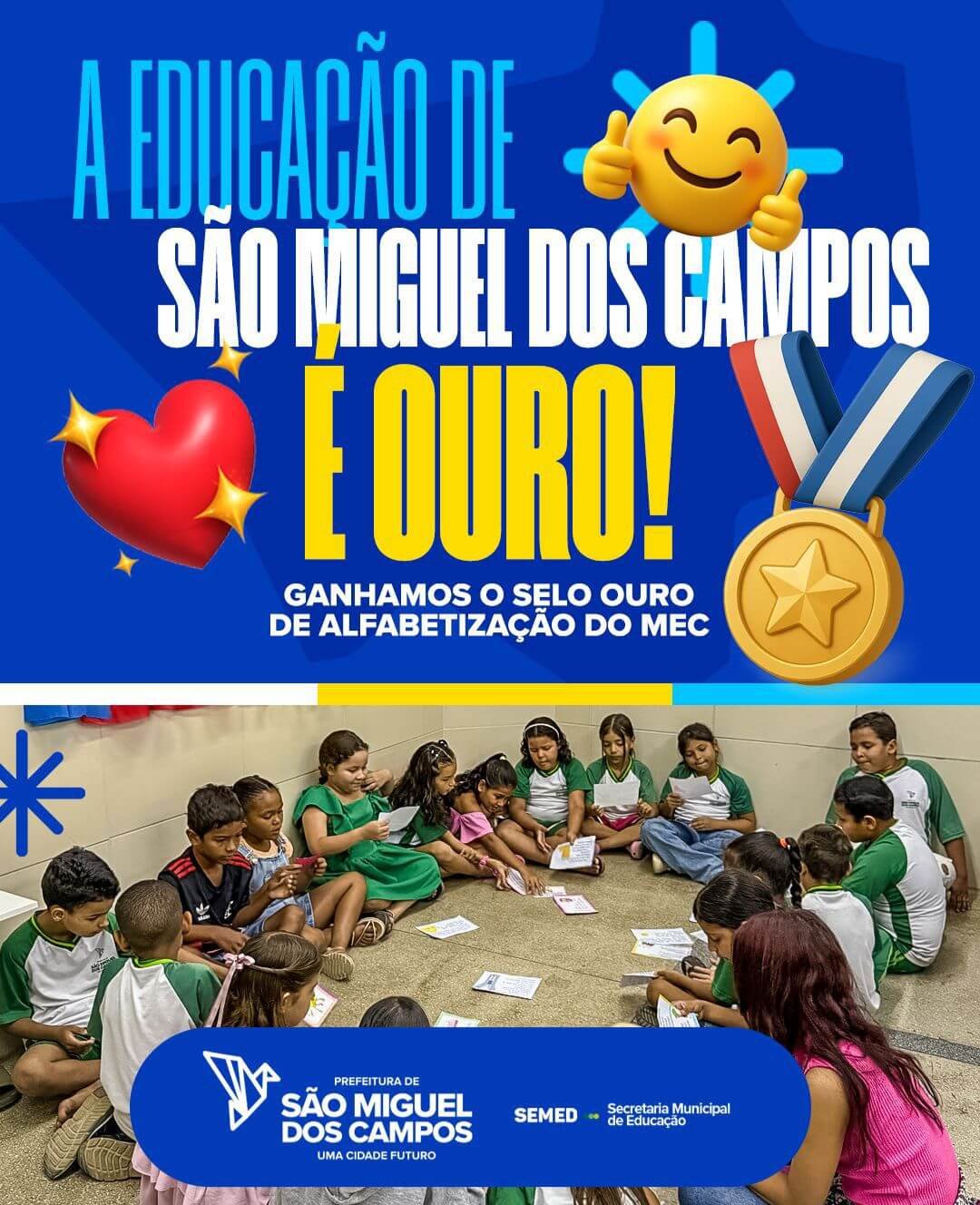 São Miguel dos Campos mais uma vez é “ouro” na alfabetização. A Educação do município foi contemplada, nesta segunda-feira (9), após o resultado oficial, pela segunda vez consecutiva, com o Selo Ouro Nacional Compromisso com a Alfabetização, concedido pelo Ministério da Educação (MEC) para os municípios que desenvolveram ações inovadoras e competentes para alfabetizar suas crianças até o final do 2º ano.