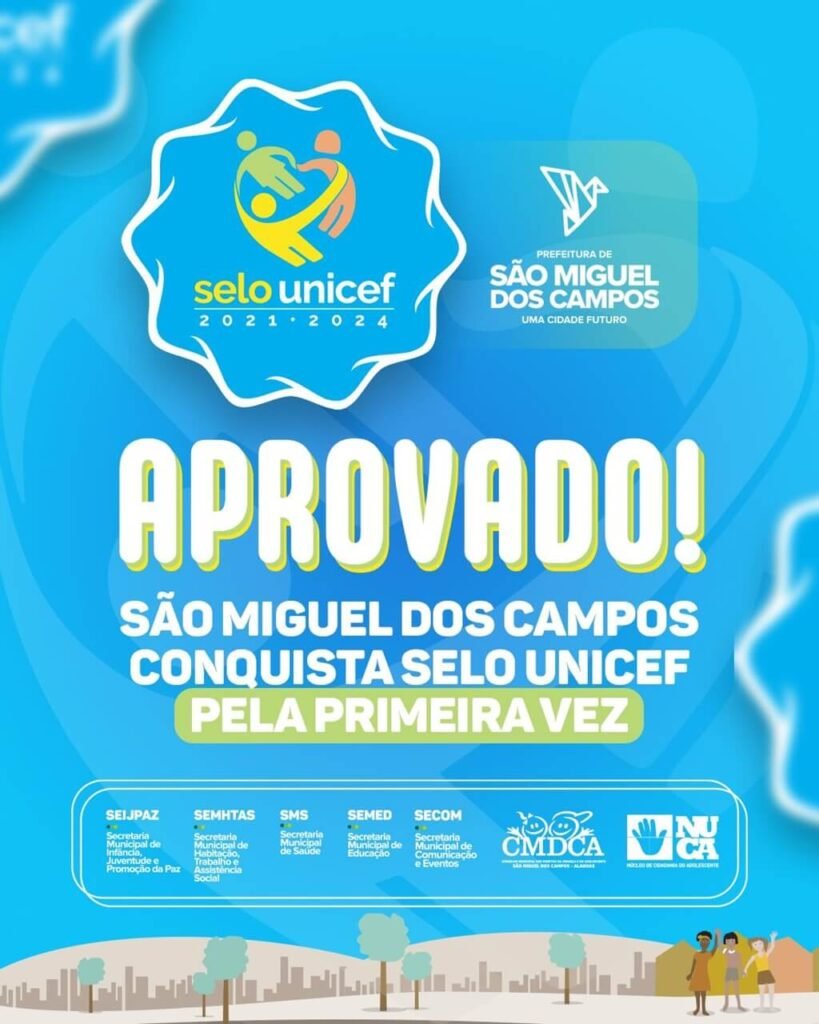 De forma inédita, São Miguel dos Campos recebeu nesta quarta-feira “, 06 de novembro de 2024, o Selo UNICEF. Ele está entre os 923 municípios brasileiros que alavancaram mais suas políticas públicas voltadas a crianças e adolescentes, entre 2021 e 2024, em comparação à média nacional em pelo menos três indicadores de saúde, educação e proteção contra violência.