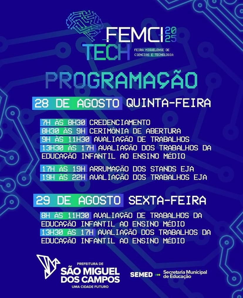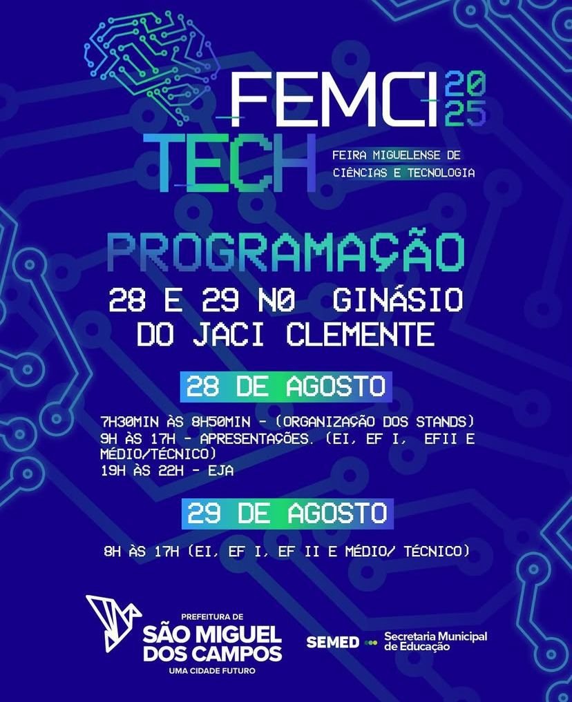 Pelo terceiro ano consecutivo, a Secretaria Municipal de Educação de São Miguel dos Campos realizará a Feira Municipal de Ciências e Tecnologia (FEMCITECH), edição 2025, que ocorrerá nos dias 28 e 29 de agosto, no Ginásio do residencial Jaci Clemente (parte alta da cidade).