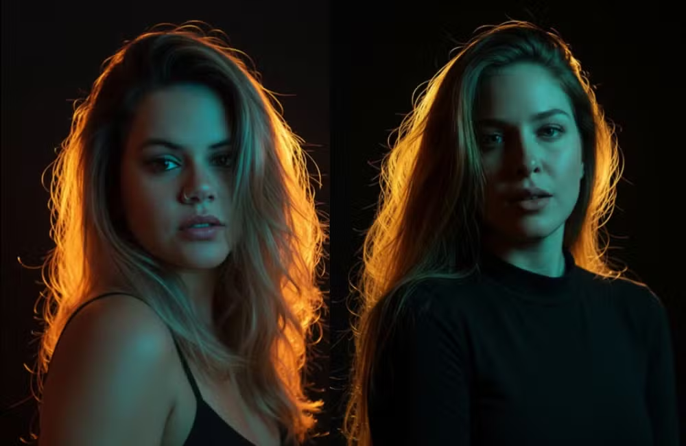- Uma fonte secundária fria (luz azul/verde) ilumina o rosto e parte do ombro, criando um contraste de cores complementares (quente no cabelo, frio na pele).