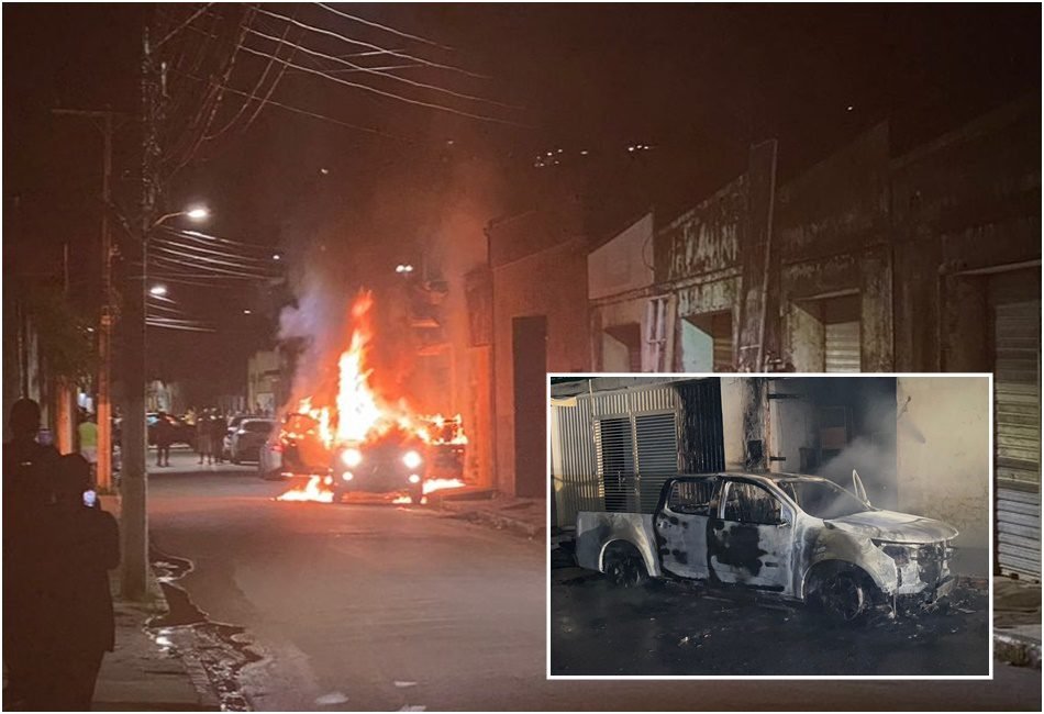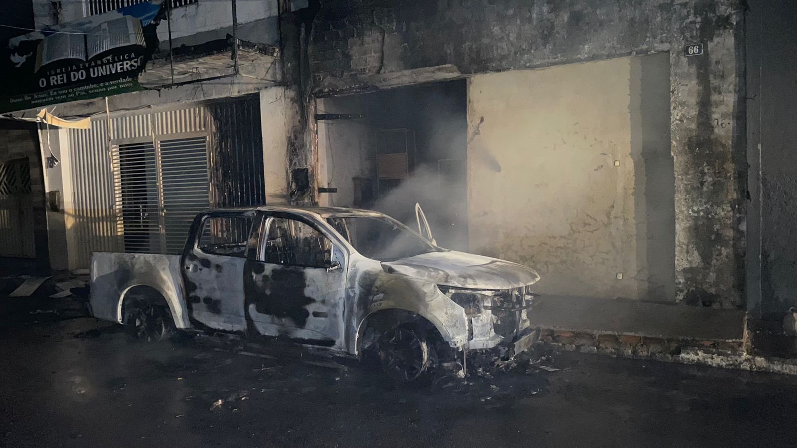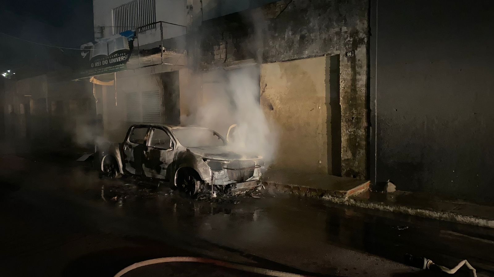 Um veículo modelo Chevrolet S10, de placa não informada, ficou completamente destruído após pegar fogo na noite desta quinta-feira, dia 27, em uma rua de grande movimentação de pessoas e carros, no Centro de São Miguel dos Campos.