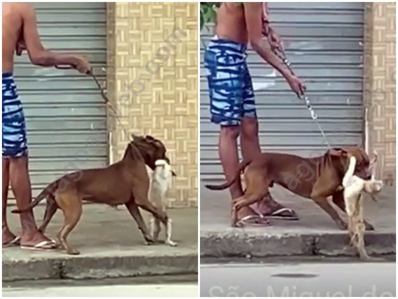 As imagens mostram um cão, que seria da raça Pitbull, esganando um gato em via pública, enquanto o animal é segurado por um homem, supostamente seu tutor. O indivíduo, de identidade desconhecida, rir durante os momentos de terror quando o cão sufoca o felino.