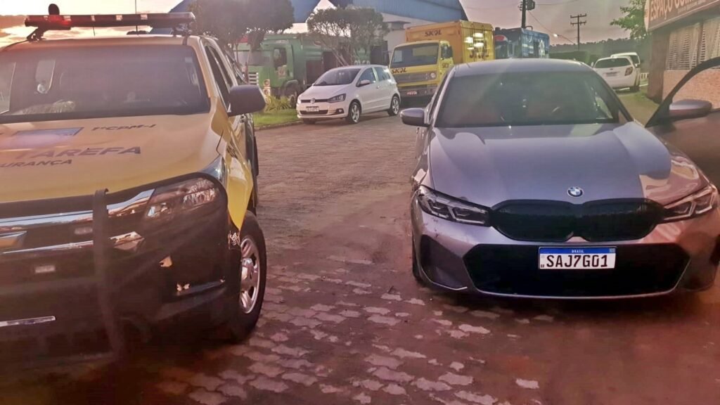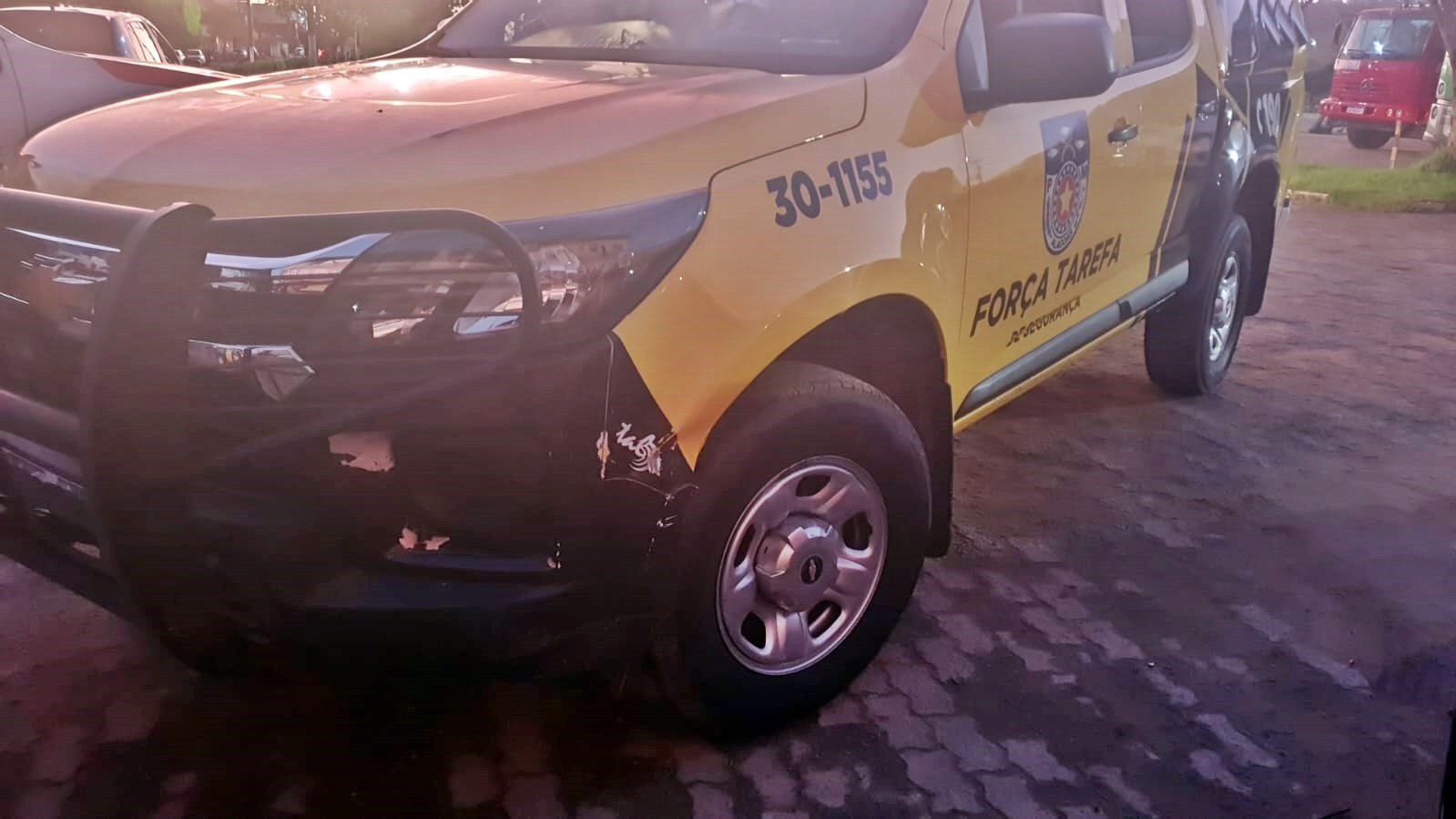 Para impedir a fuga, a guarnição atravessa a viatura na via, mas ainda assim o condutor da BMW, um menor de 17 anos, inabilitado, tenta passar e acaba colidindo no veículo da PM.